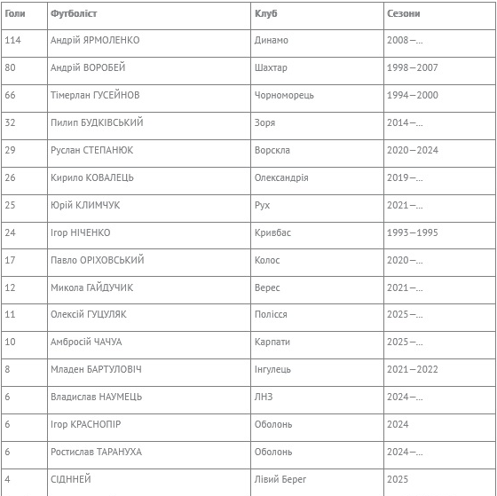 У шести клубах у сезоні 2024/25 змінилися найкращі бомбардири в історії виступів у чемпіонатах України