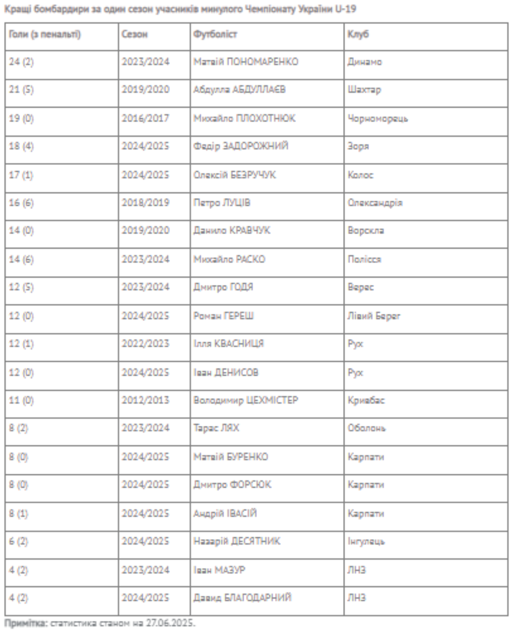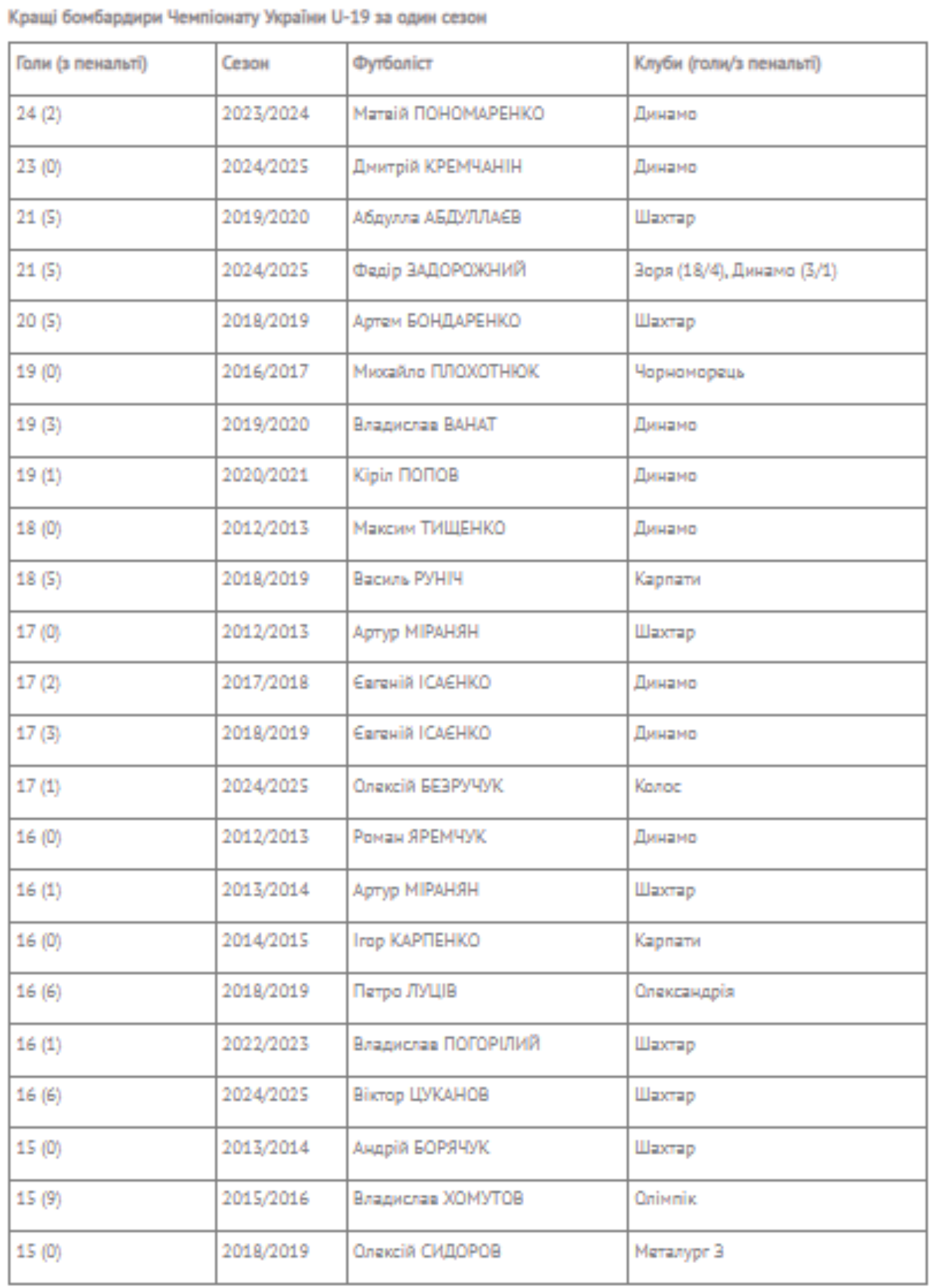 За підсумками минулого першості U-19 новими клубними рекордсменами за сезон стали також Олексій Безручук ("Колос") та Назарій Десятник ("Інгулець").