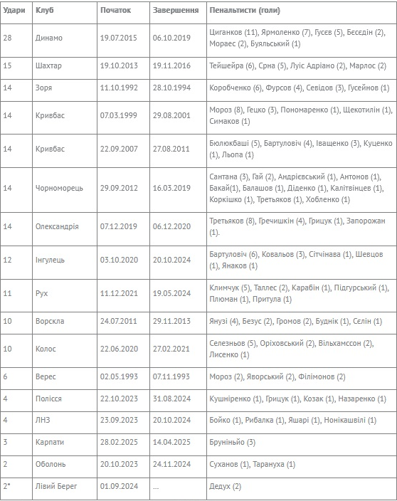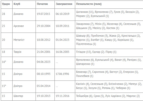 Найдовші серії реалізацій пенальті гравцями одного клубу в Чемпіонаті України
