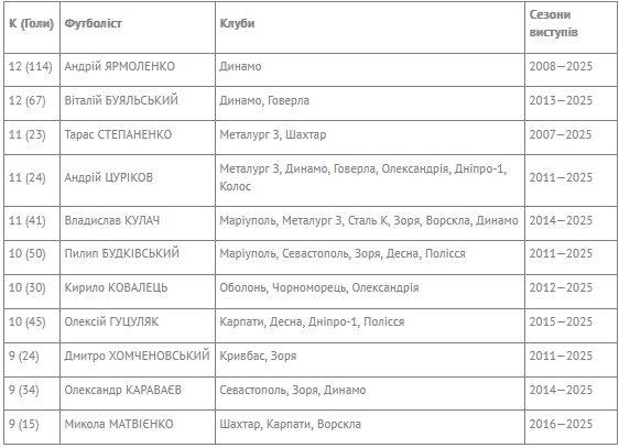 Учасники сезону 2024/2025 з найбільшою кількістю гольових сезонів в Чемпіонаті України