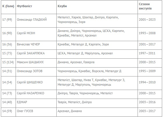 А лідером у цьому рейтингу залишається Олександр Гладкий, в активі якого 17 гольових сезонів.