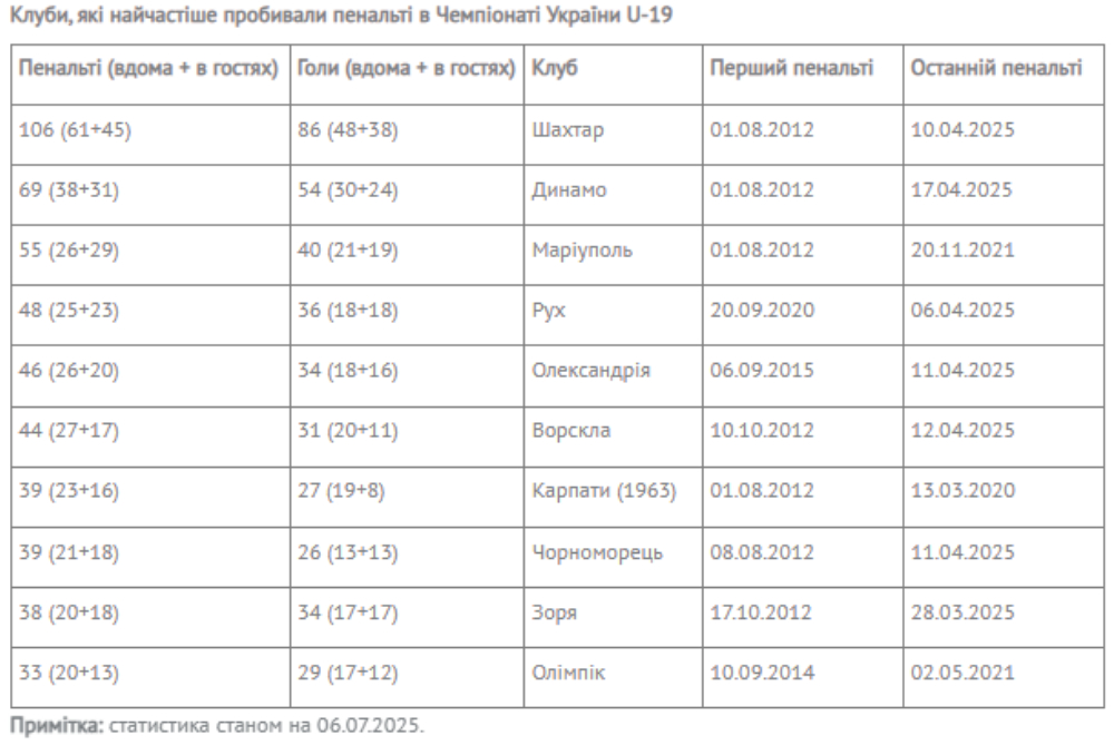 Найчастіше в минулому сезоні в першості U-19 пробивали пенальті футболісти "Шахтаря". "Динамо" посідає друге місце за всю історію