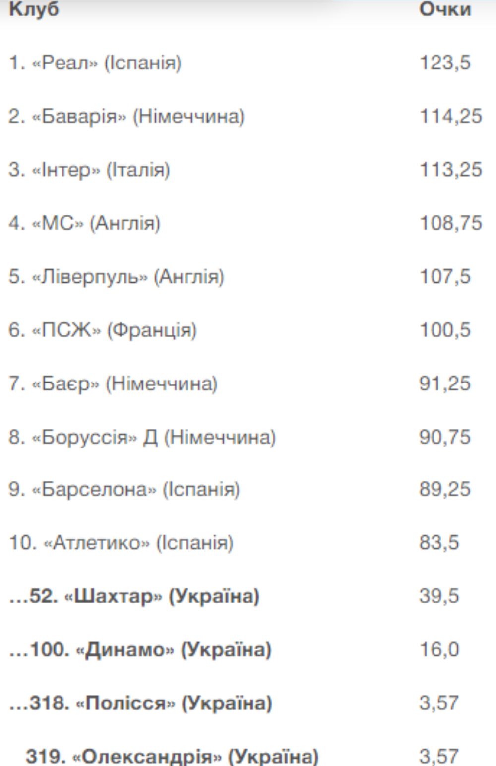 Київське "Динамо" розташовується в ньому рівно на 100-му місці, маючи у власному активі 16 балів.