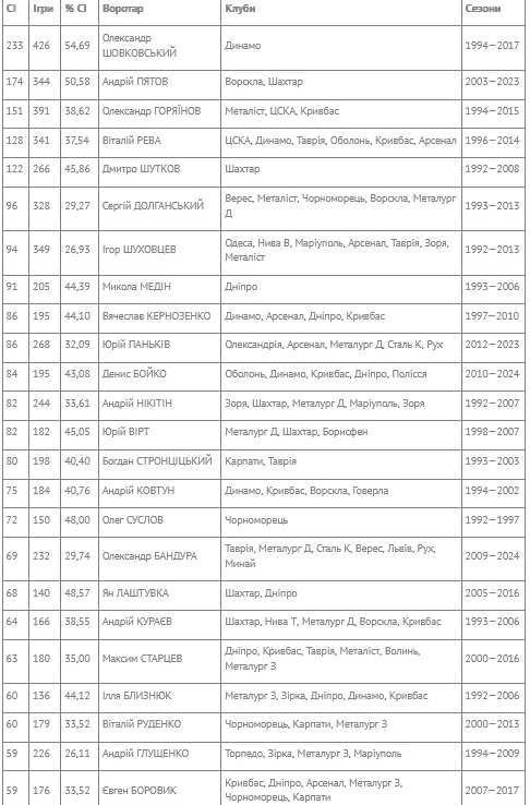 Впевнено ж очолює цей історичний рейтинг воротарів Чемпіонату України легендарний Олександр Шовковський — 233 гри без пропущених м’ячів.