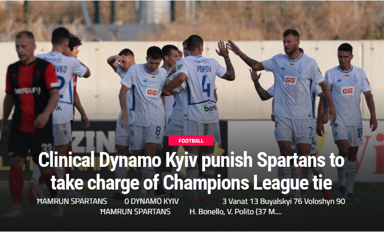 - На стадіоні "Тоні Беззина" у матчі другого кваліфікаційного раунду Ліги чемпіонів УЄФА київське "Динамо" виявилося сильнішим за "Хамрунських спартанців", здобувши перемогу з рахунком 3:0.
