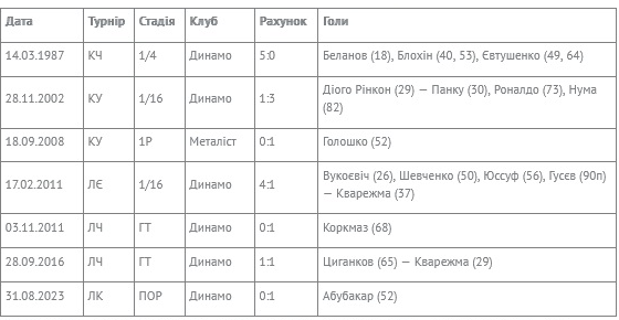 Примітка: КЧ — Кубок Чемпіонів, КУ — Кубок УЄФА, ЛЄ — Ліга Європи, ЛЧ — Ліга Чемпіонів, ГТ — груповий турнір, КР2 — 2-й кваліфікаційний раунд.