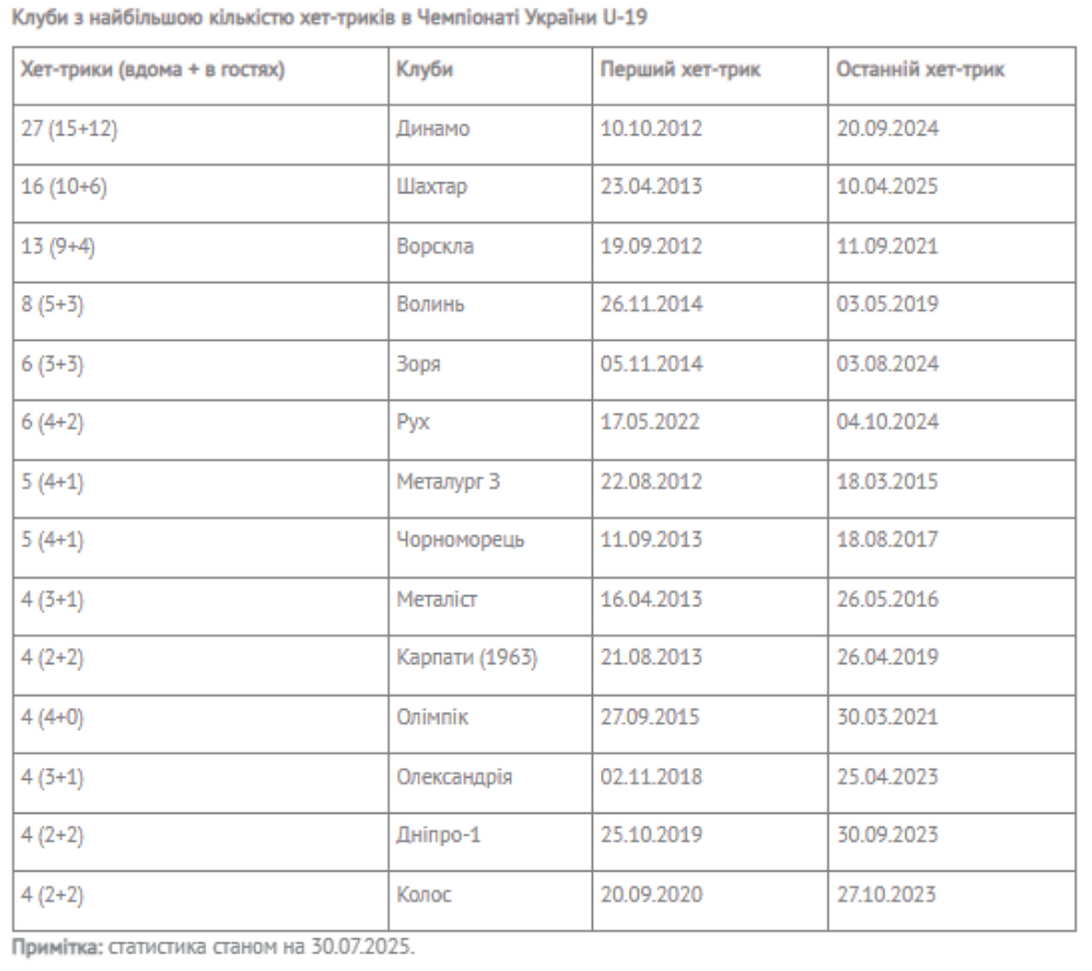У минулому сезоні у першості України U-19 було зафіксовано 9 хет-триків гравців 7-ми клубів. Найчастіше, по 2 рази, відзначилися юнаки "Динамо" та "Полісся".