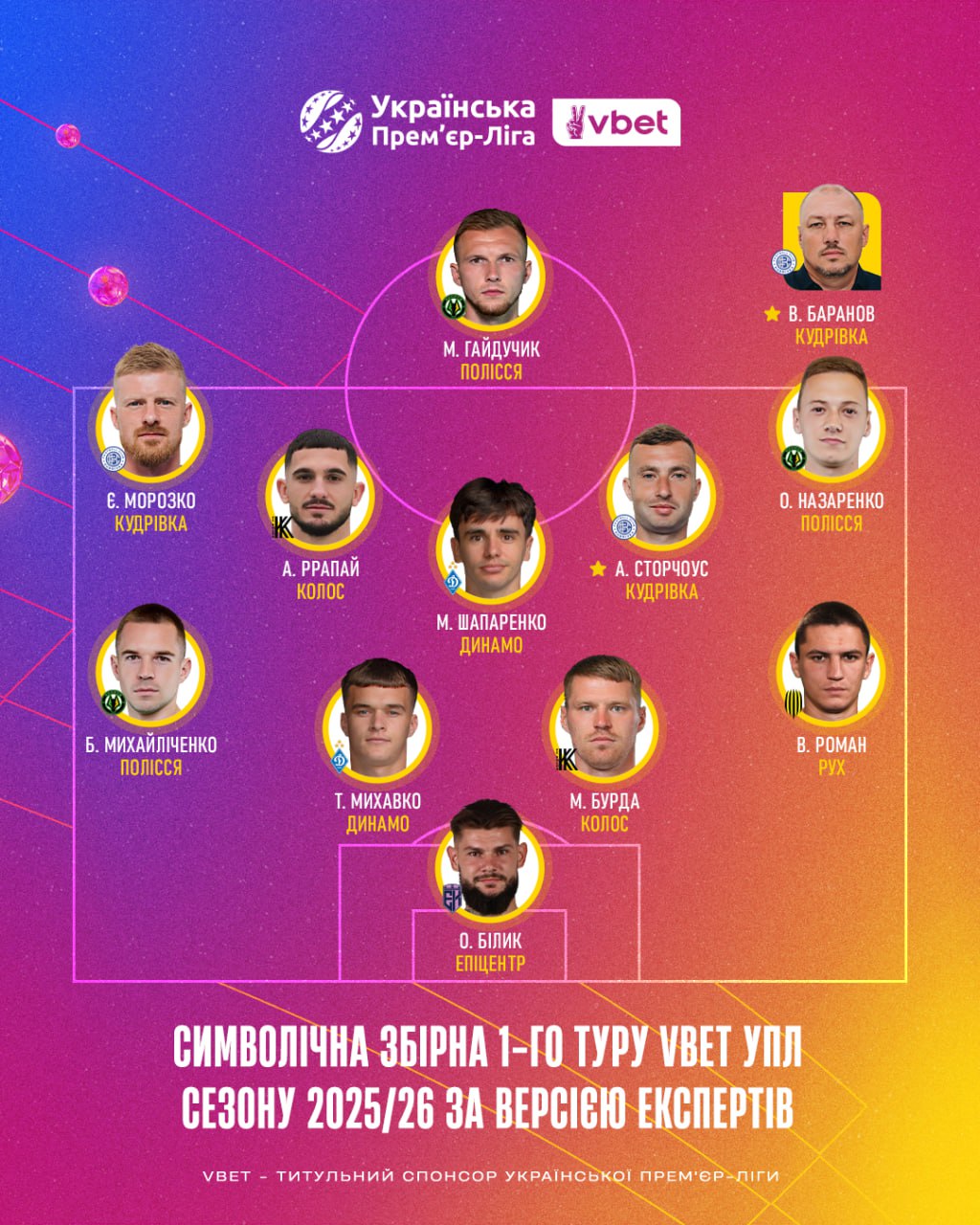 Українська Прем’єр-Ліга розпочинає відзначати героїв сезону 2025/26 і склала символічну збірну 1-го туру УПЛ, а також назвала найкращого гравця та найкращого тренера 1-го туру. Традиційно це було зроблено разом з ведучими, експертами, коментаторами УПЛ ТБ та представниками провідних спортивних ЗМІ України. Цього разу їх було 40.