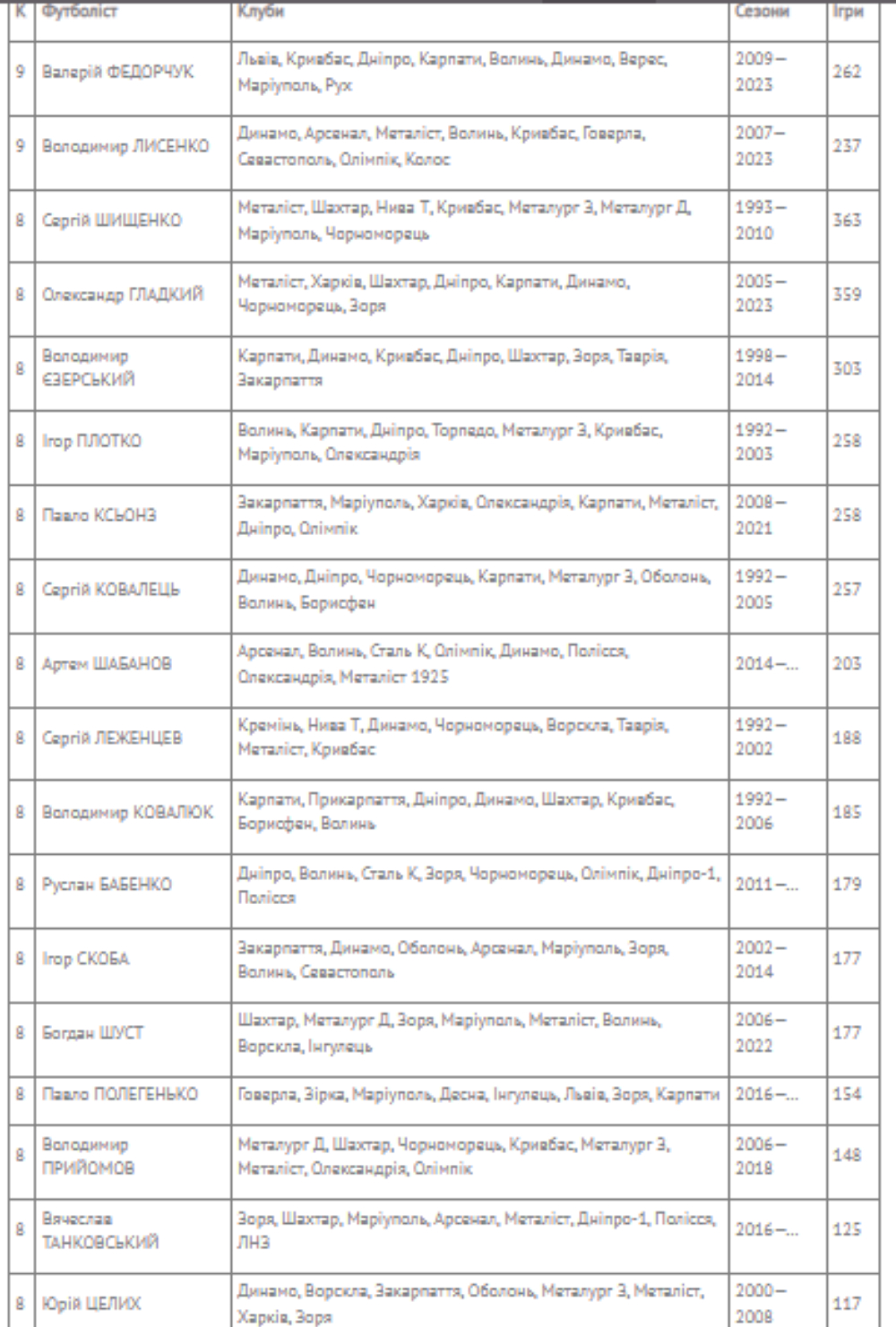 За всю ж історію чемпіонату України очолюють список гравців з найбільшою колекцією клубів УПЛ Валерій Федорчук та Володимир Лисенко — по 9.
