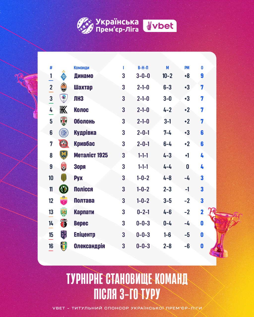 "Динамо" - одноосібний лідер. Турнірна таблиця УПЛ після третього туру