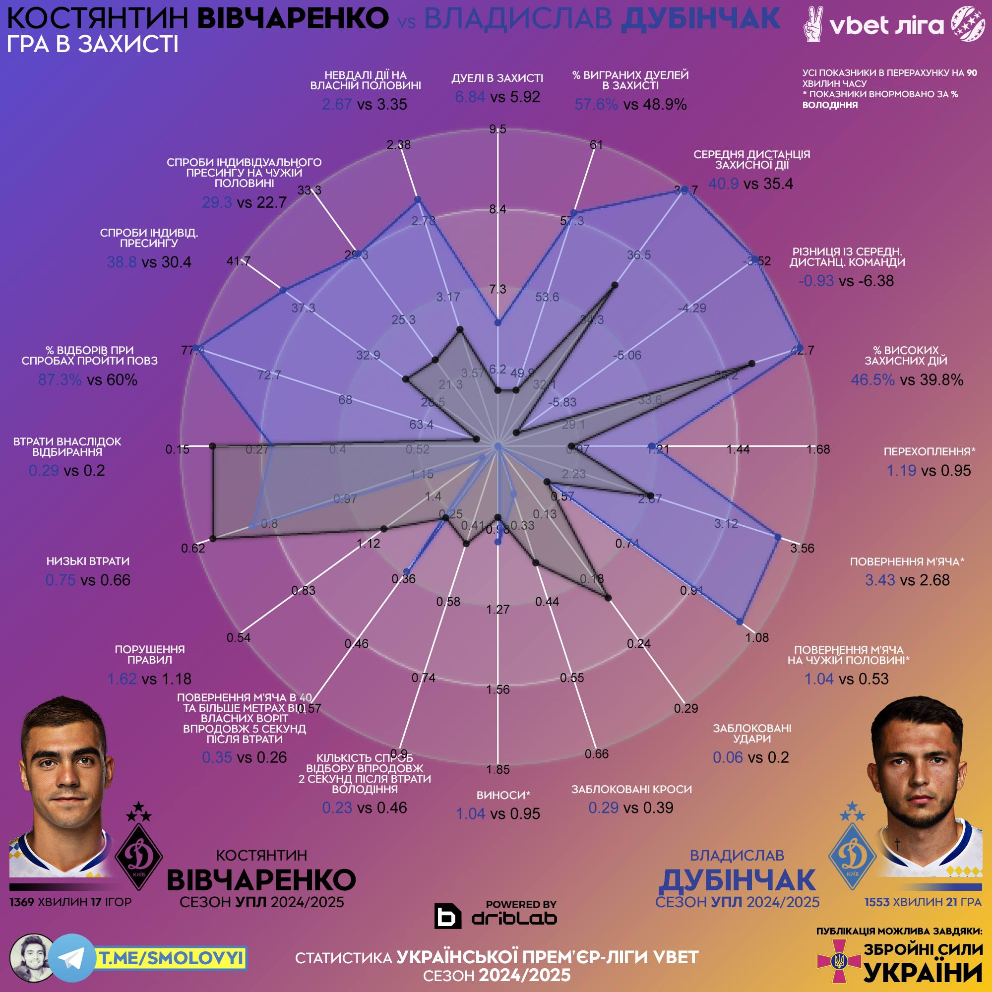 • по дотичній бачимо, що Дубінчак виграє 57.6% дуелей в захисті, а Вівчаренко - 48.9%