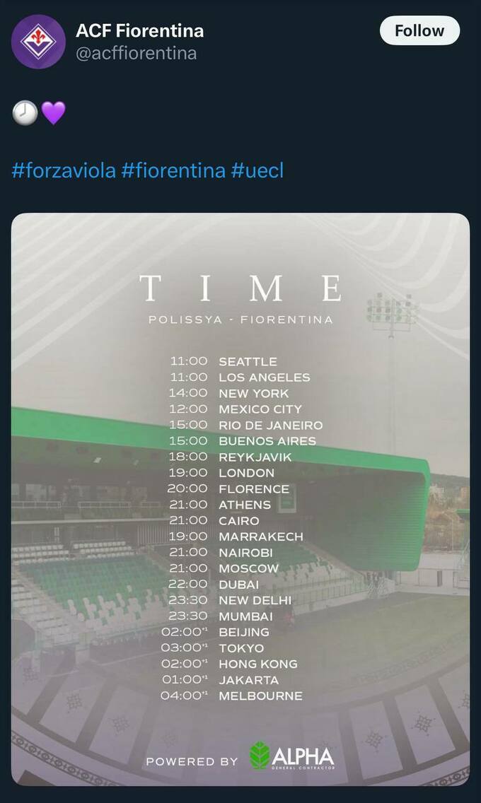Іноземний клуб анонсував сьогоднішній матч з "Поліссям" вказуванням часу його початку в різних містах світу, де знайшлося місце й Москві.