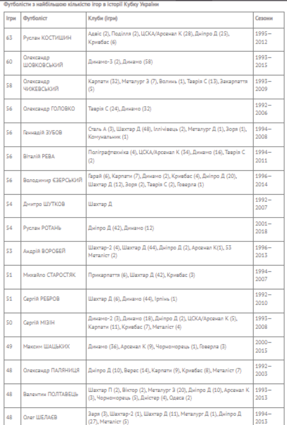 Головний тренер "Динамо" Олександр Шовковський посідає друге місце за кількістю матчів у Кубку України. У цьому турнірі він провів 60 поєдинків.