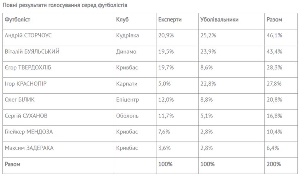 А на другому етапі відбулося власне голосування. Причому провели окреме голосування серед уболівальників в інтернеті і окреме голосування коментаторів, експертів УПЛ ТБ та представників ЗМІ.