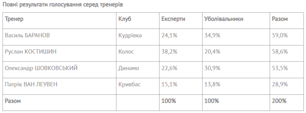 Серед тренерів перемогу здобув Василь Баранов, якого на перше місце в рейтингу підняли уболівальники — вони віддали йому 34,9% голосів. У експертів лідером був Руслан Костишин (38,2%), а в сумарному рейтингу Баранов на 0,4% випередив Костишина.
