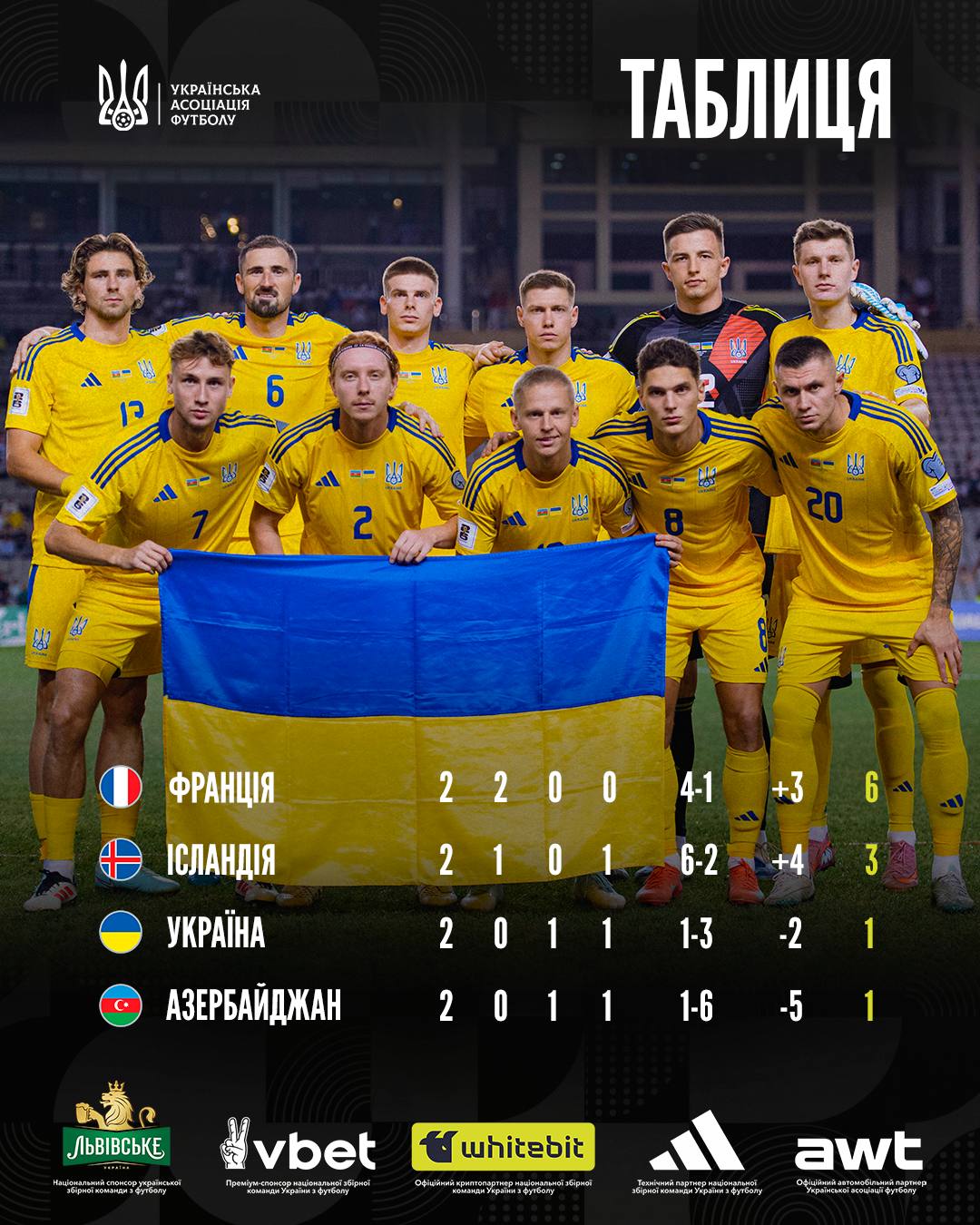 Україна - не остання. Турнірна таблиця нашої групи відбору ЧС-2026 після двох турів