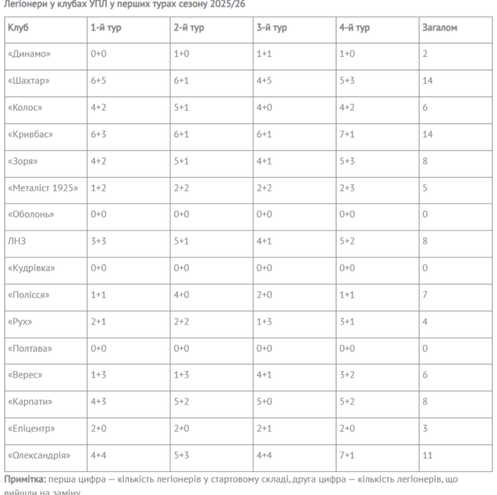 У матчах 4-х стартових турів УПЛ взяли участь 96 легіонерів. Тільки у трьох команд УПЛ заграно менше легіонерів, ніж в "Динамо"