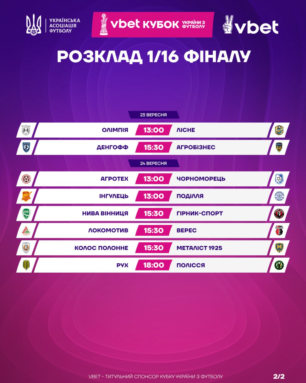 Визначено дати та час матчів 1/16 фіналу VBET Кубку України сезону 2025/26.