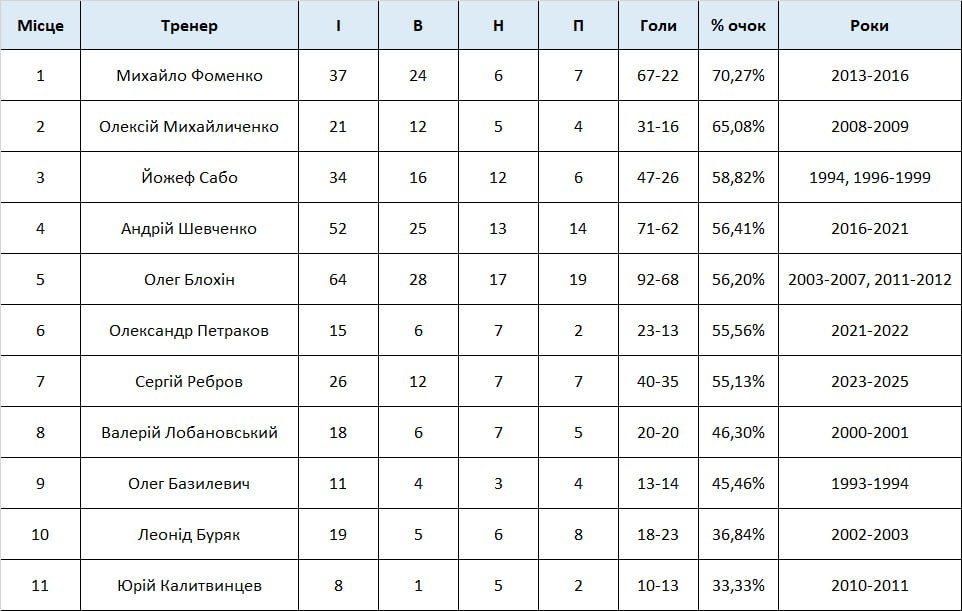 Статистика головних тренерів збірної України з 8+ матчів на чолі команди.