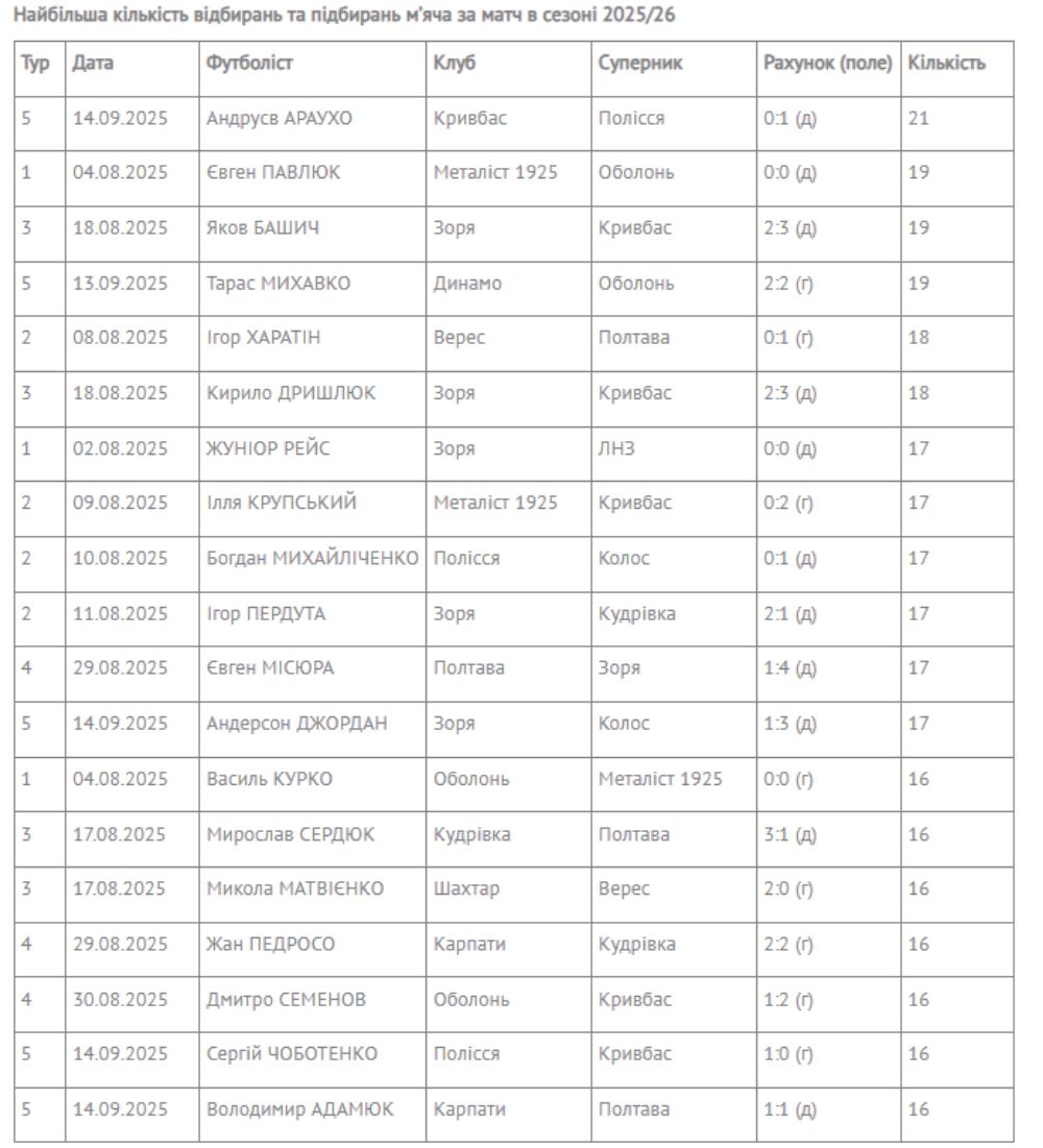 У матчі 5-го туру проти "Полісся" венесуельський півзахисник "Кривбасу" Андрусв Араухо оновив рекорд сезону 2025/26 в УПЛ за кількістю відбирань та підбирань м’яча (21).