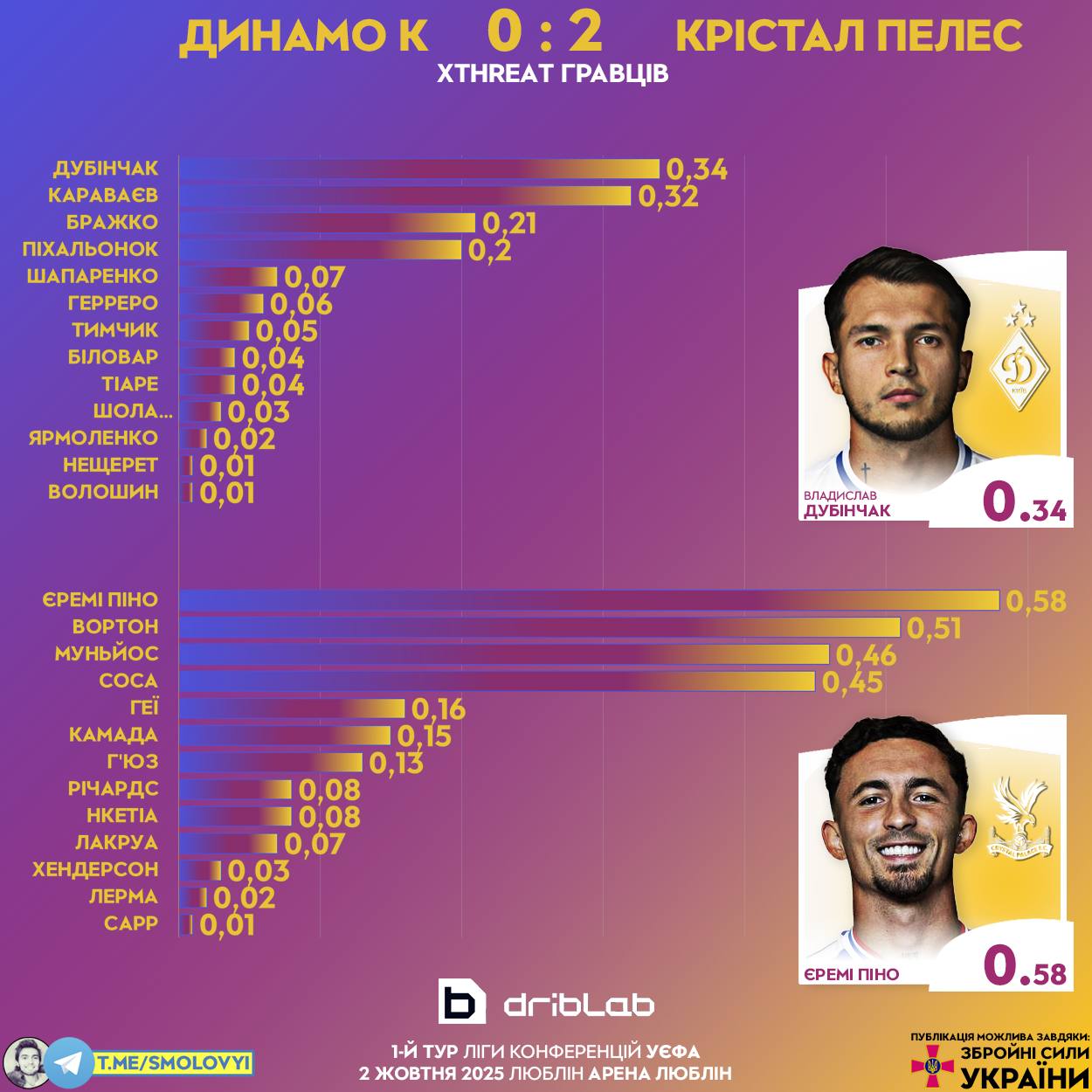 "Динамо" накрутило вдвічі менший показник очікуваної гостроти, ніж у матчі з "Карпатами", - 1.30 xThreat. У "Пелас" - 2.5, що навіть нижче львівського результату киян (2.7). Це дозволяє провести паралель: кияни у Львові грали не на максимумі, і, певно, "Пелас" теж не викладався повністю.
