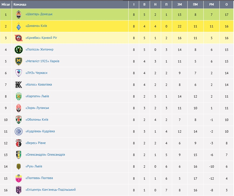 Пропонуємо до Вашої уваги турнірну таблицю УПЛ після 8-го туру.