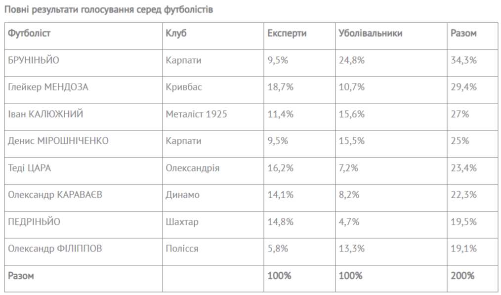 Але за сумою відсотків голосів експертів та уболівальників перше місце — у Брунінью.