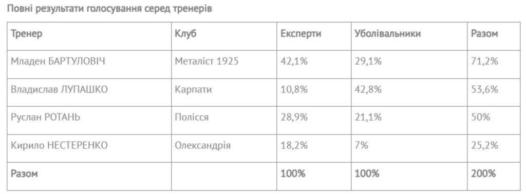 Серед тренерів перемогу здобув Младен Бартуловіч, який отримав найбільшу долю голосів експертів та другу долю голосів уболівальників. Його "Металіст 1925" у вересні набрав 7 очок з 9-ти можливих в УПЛ (нічия з "Шахтарем", перемоги над "Полтавою" та "Колосом") та пройшов до 1/8 фіналу Кубка України.