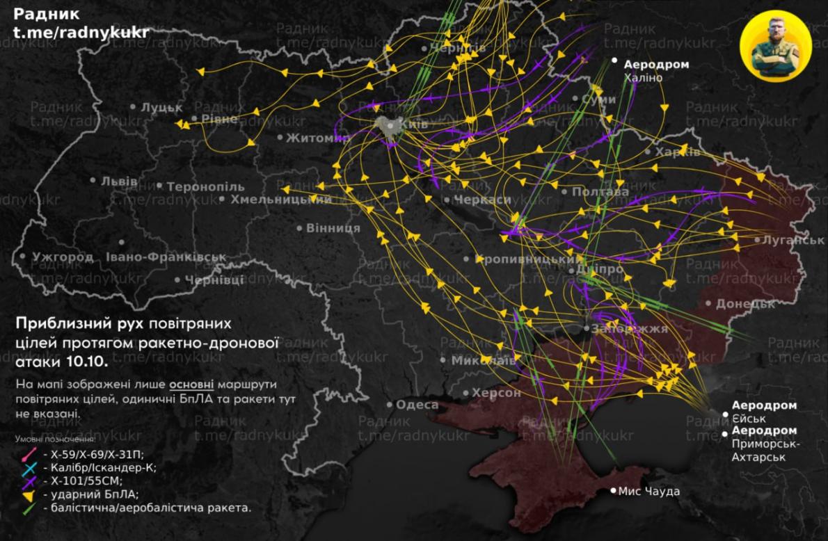 Зафіксовано прямі влучання 13-ти ракет та 60-ти ударних БпЛА на 19-ти локаціях та падіння збитих (уламки) на 7-ми локаціях.
