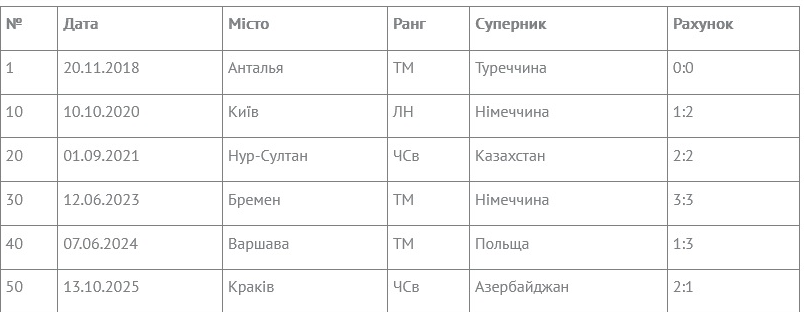 Примітка: ЧСв — відбірковий турнір чемпіонату світу, ТМ — товариський матч, ЛН — Ліга націй; статистика станом на 15.10.2025.