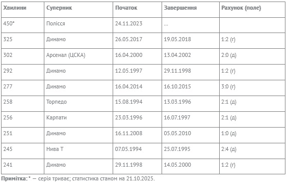 Найдовші безгольові серії «Шахтаря» з одним клубом в Чемпіонаті України