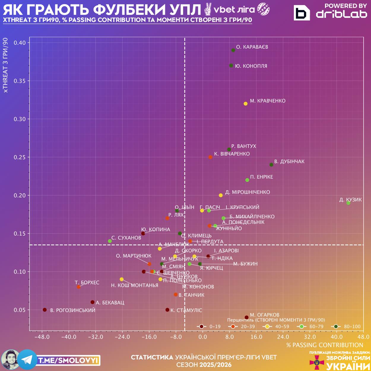 З’являються питання по Микиті Кравченку. Наче поруч із топами, але за моментами - лише 40–59 перцентиль.