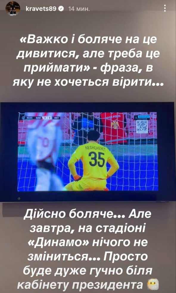 Дійсно боляче... Але завтра на стадіоні "Динамо" нічого не зміниться... Просто буде дуже гучно біля кабінету президента", - написав Кравець у соцмережі.