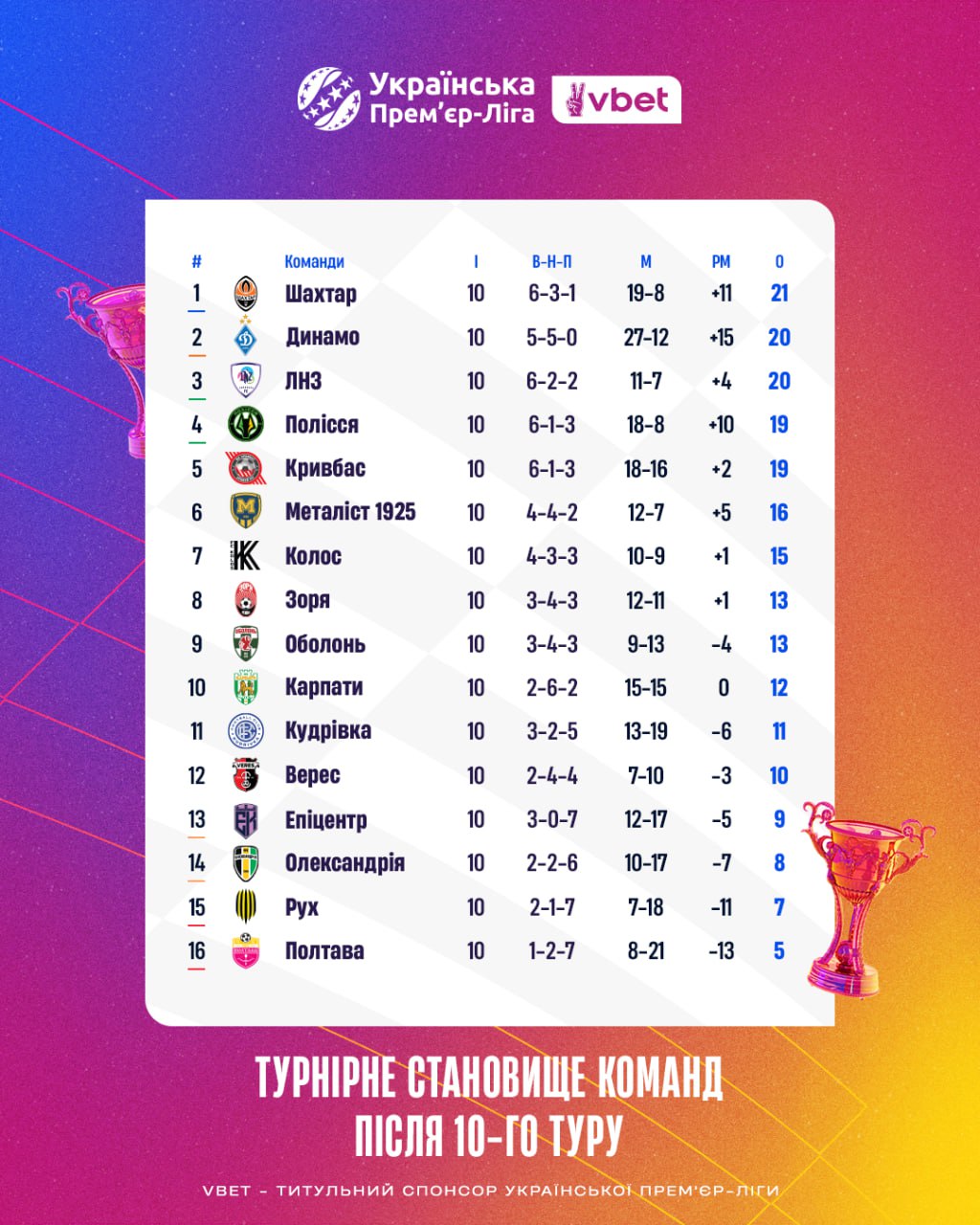 "Динамо" на другому місці. Турнірна таблиця УПЛ після 10-го туру