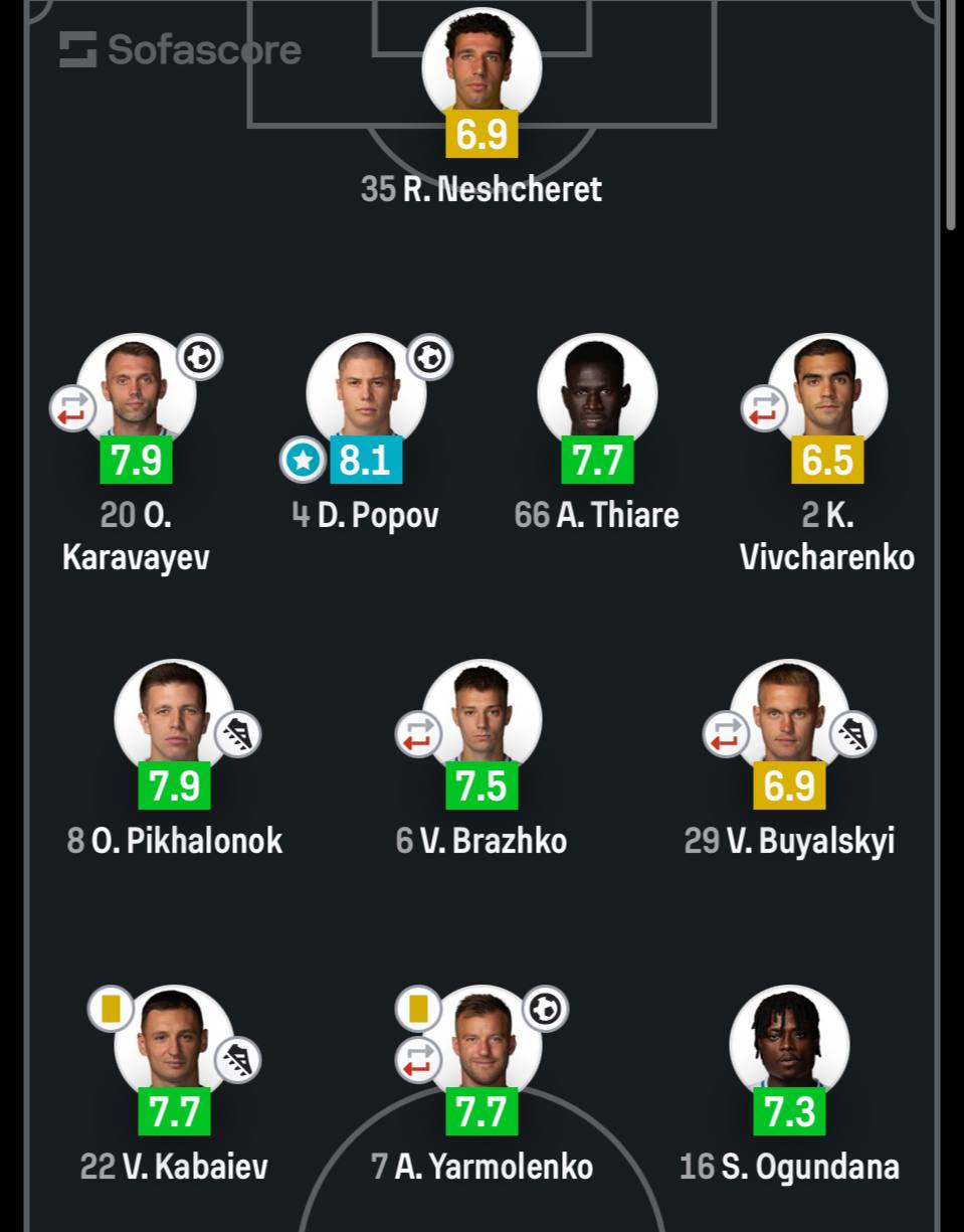 Статистичний портал SofaScore ввважає, що кращим гравцем матчу "Динамо" - "Кривбас" став захисник киян Денис Попов, котрий отримав оцінку 8,1.