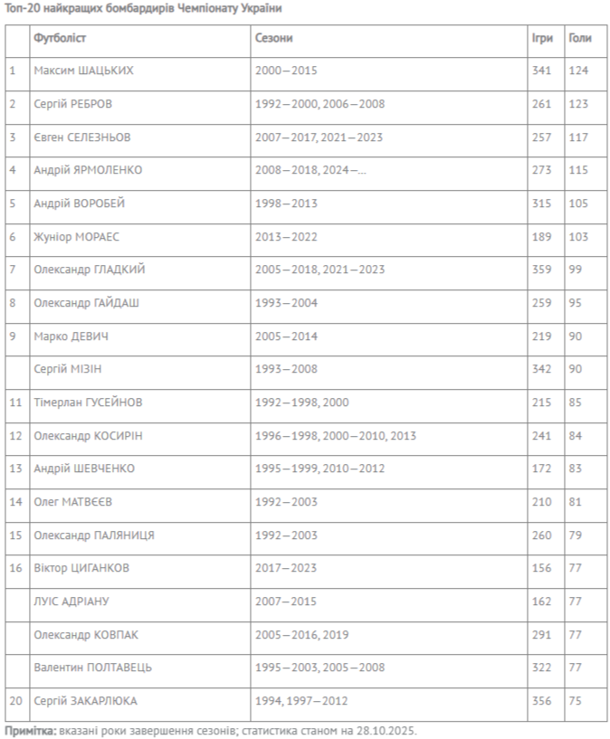 Після матчів 10-го туру УПЛ відбулася зміна в історичному списку найкращих бомбардирів чемпіонату України. Лідером рейтингу залишається Максим Шацьких, в активі якого 124 голи.