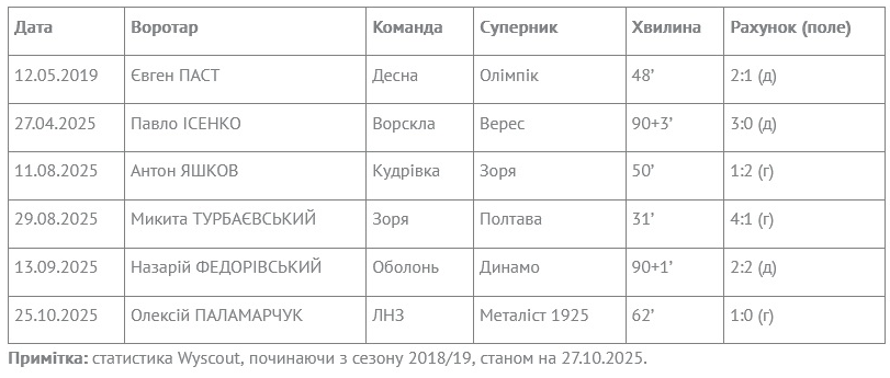 П’ятий раз у 2025 році та четвертий раз у сезоні 2025/26 воротар клубу УПЛ став автором результативного пасу в матчі Чемпіонату України. Тенденція вертикалізації в українському футболі продовжується, цікаво було б почути думку експертів з цього приводу. Тим більше, що до 2025 року востаннє воротар відзначався ассистом ще у травні 2019-го.