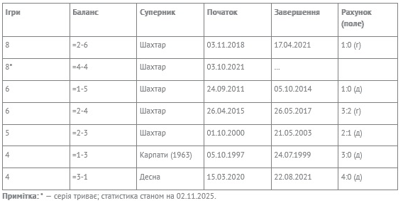 Найдовші безвиграшні серії «Динамо» у зустрічах з одним клубом в Чемпіонаті України