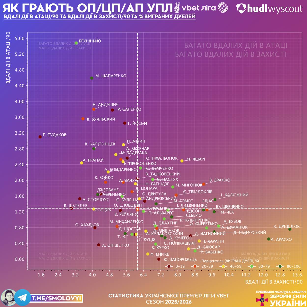 Георгій за свої останні хвилини в УПЛ був із відривом найгіршим хавом за кількістю вдалих дій у захисті. Зараз він пішов і віддав свій титул запасному гравцю "Полісся" - Володимиру Шепєлєву. Дійсно цікаво, коли говорять про інтенсивність Володимира, то на що люди орієнтуються? На кількість пробігу? На кількість спроб відбору впродовж двох секунд після втрати? Бо на обсяг вдалих дій в атаці та захисті посилатися важко. Навіть Буяльський виграє більший % боротьби за Шепелєва.