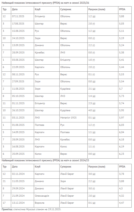 Найкращий середній показник PPDA у сезоні 2025/26 в УПЛ має "Шахтар" (7,86). До топ-5 рейтингу також входять "Рух" (8,61), "Карпати" (8,93), ЛНЗ (8,98) та "Полтава" (9,06).