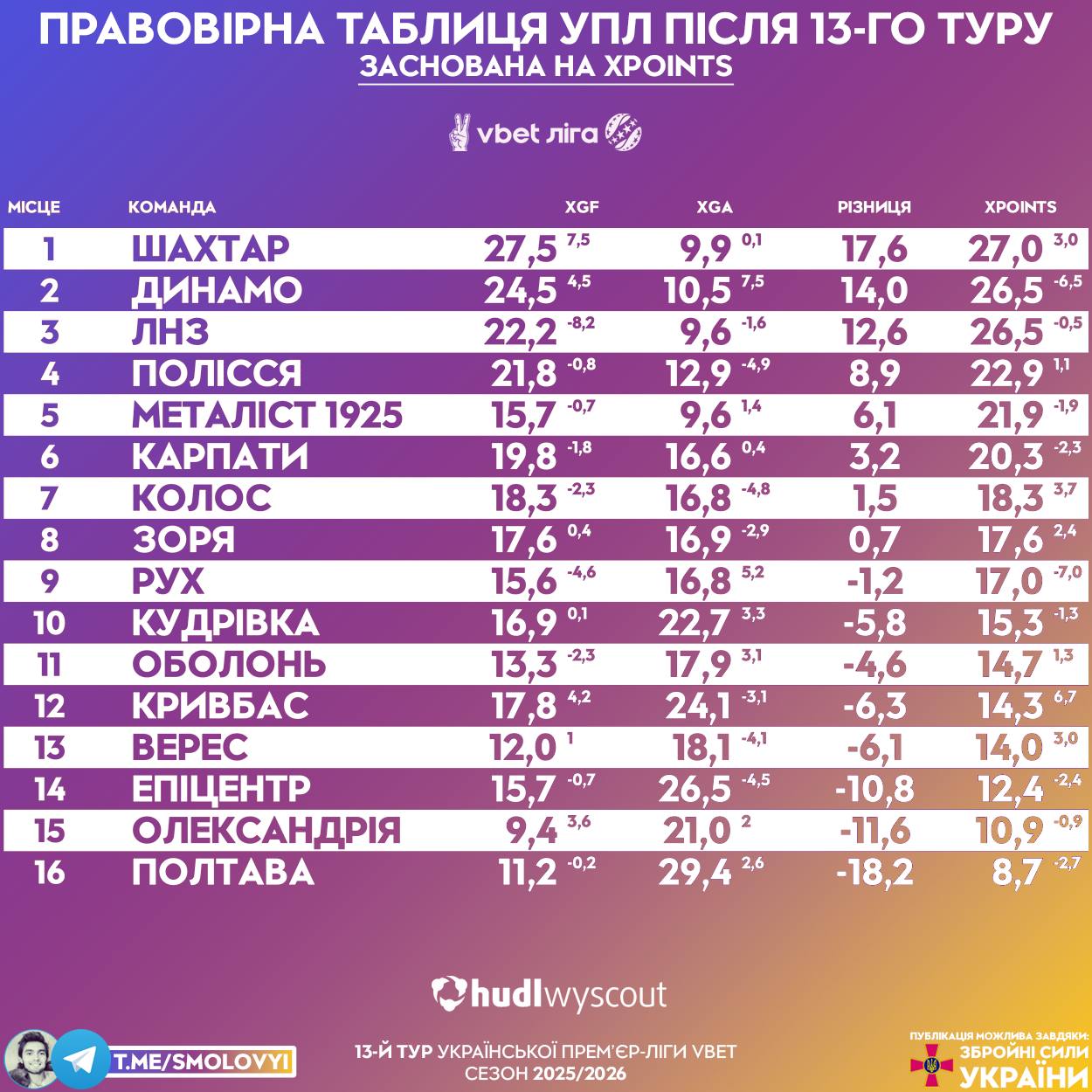 Футбольний блогер Михайло Смоловий проаналізував турнірну таблицю УПЛ на основі очікуваних забитих та пропущених голів.