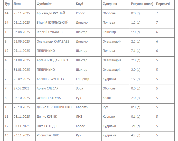 Також у матчі з «Полтавою» Віталій Буяльський віддав 7 ключових передач — стільки ж, скільки албанський півзахисник Арінальдо Ррапай («Колос») — у матчі проти «Оболоні». Ррапай (якщо брати у хронологічній послідовності) оновив рекорд сезону 2025/26, а Буяльський його повторив.