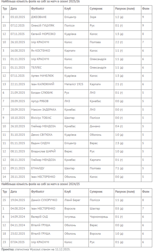В матчі 15-го туру з "Рухом" вінгер "Полісся" та національної збірної України Олексій Гуцуляк заробив на собі дев’ять фолів, що стало повторенням рекорду сезону 2025/26 в УПЛ. Першим стільки фолів на собі назбирав бразилець Джеоване з "Епіцентру" — на початку жовтня.