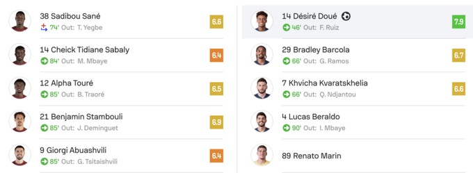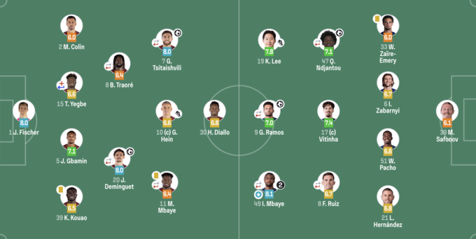 Український захисник паризького клубу Ілля Забарний отримав оцінку 6,7, котра стала посередньою в цьому поєдинку.