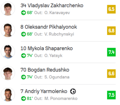 Найкращим у київській команді став Назар Волошин (оцінка - 8,2), зовсім трохи йому поступився Костянтин Вівчаренко (8,0).