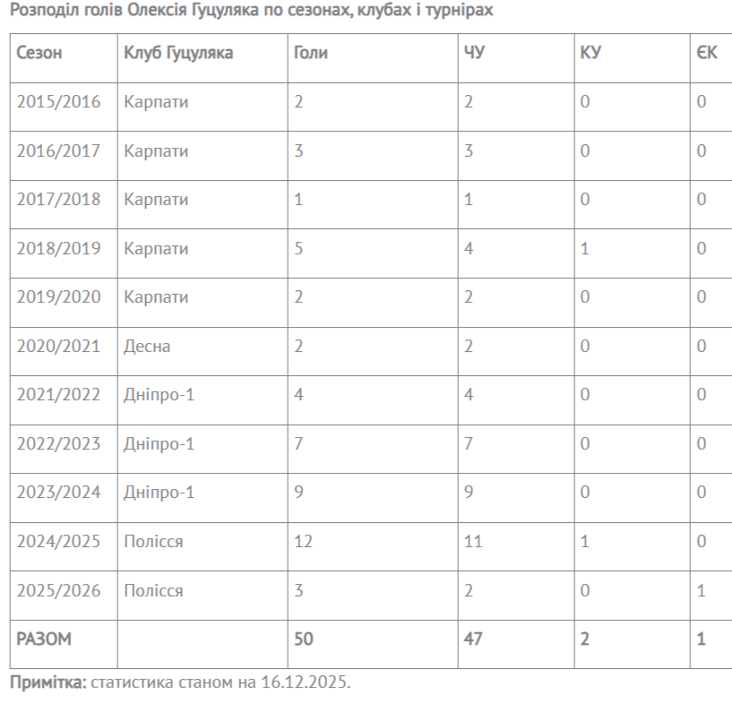 У матчі 16-го туру УПЛ "Полісся" — "Карпати" (3:2) гравець житомирського клубу Олексій Гуцуляк забив ювілейний, 50-й гол на клубному топ-рівні.