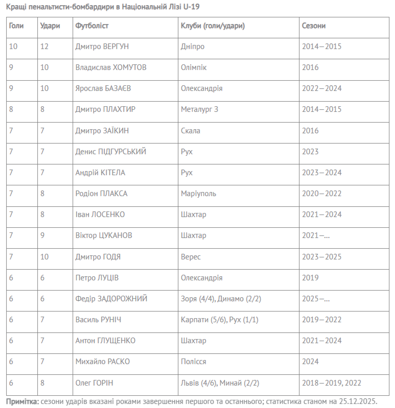 В ході першої частини сезону 2025/26 у першості U-19 відбулися зміни в списку кращих пенальтистів-голеадорів. Федір Задорожний ("Динамо") у матчі з "Кривбасом" збільшив кількість своїх реалізованих пенальті до 6-ти і за цим показником розділяє 12—17 місця в історичному реєстрі.