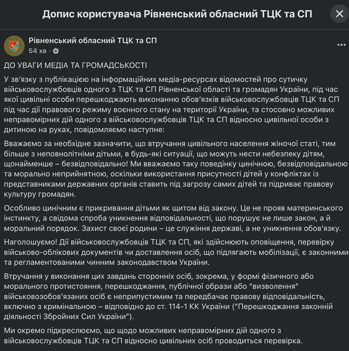 У Рівненському ТЦК та СП виправдали свого військовослужбовця і заявили, що жінка з дитиною поводилася безвідповідально.