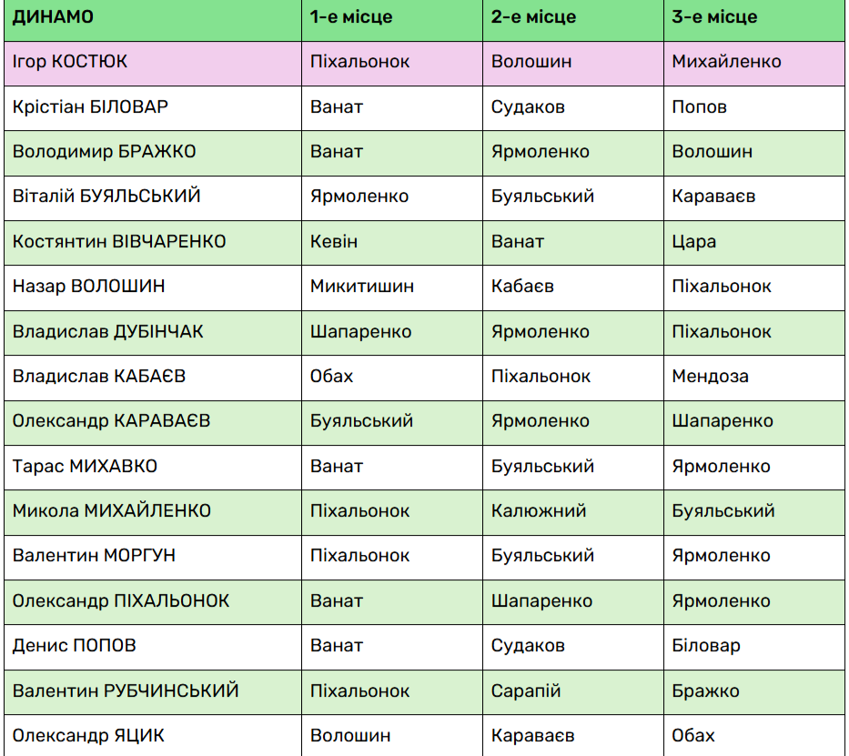 Майже всі проголосували за динамівців, окрім трьох. Зокрема, Костянтин Вівчаренко обрав Кевіна з "Шахтаря", Назар Волошин проголосував за Артура Микитишина з "Кривбасу", а Владислав Кабаєв обрав Проспера Оба, котрий виступав за ЛНЗ, а тепер перейшов у "Шахтар".