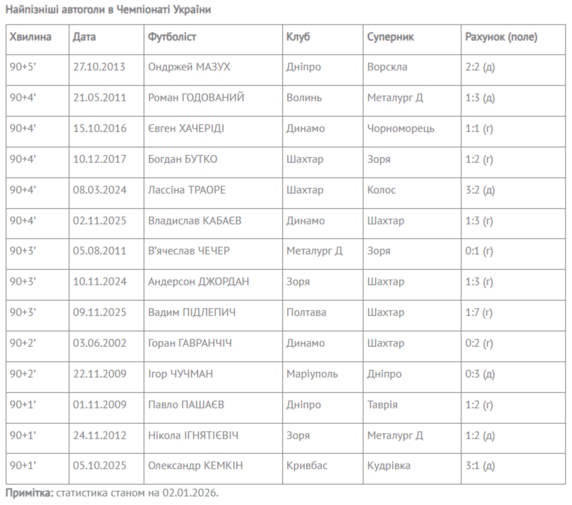 В ході сезону 2025/26 до цього рейтингу потрапили також Вадим Підлепич ("Полтава"), який у грі з "Шахтарем" забив гол у власні ворота на 90+3-й хвилині, та Олександр Кемкін ("Кривбас") — у грі з "Кудрівкою" на 90+1-й хвилині.